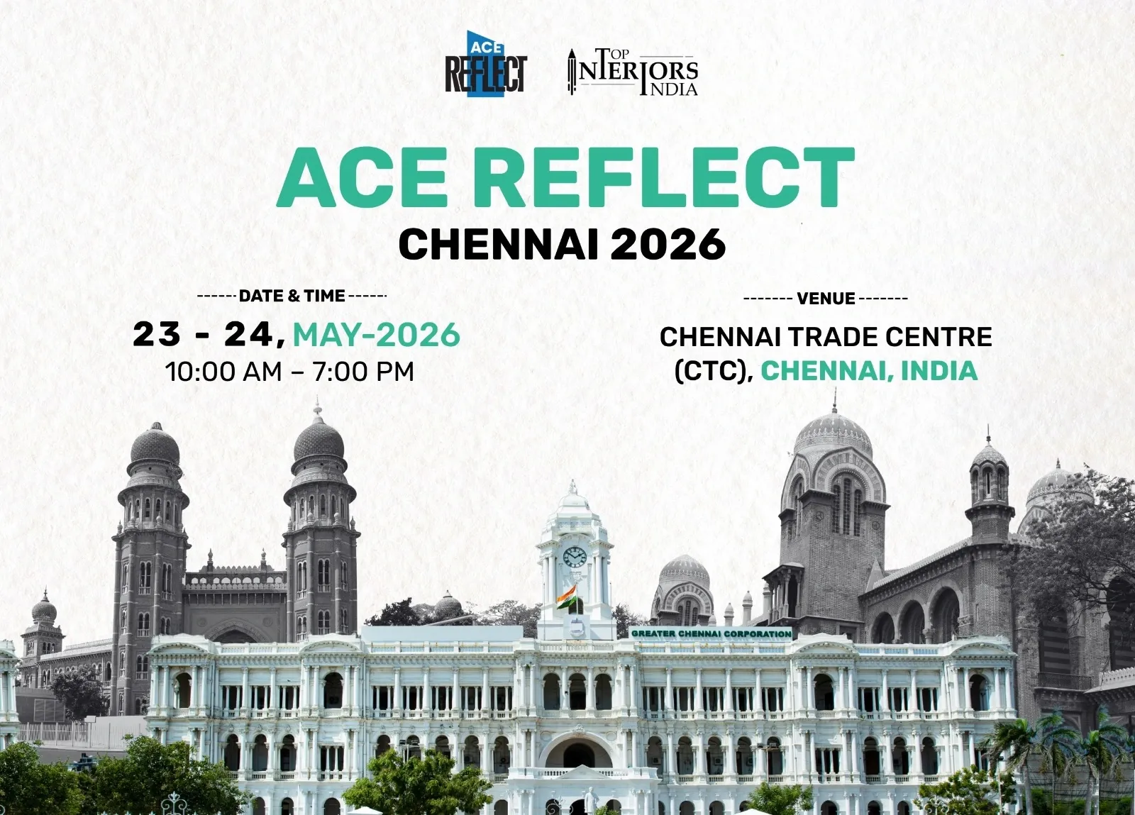 Ace Reflect Chennai 2026 will take place on 23rd–24th May 2026, from 10:00 AM to 7:00 PM, at the Chennai Trade Centre, Chennai, India.
