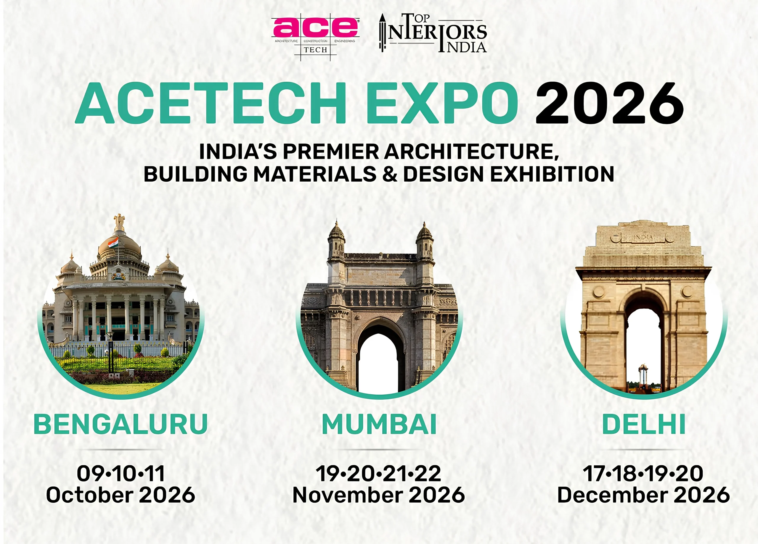 ACETECH Expo 2026 will be hosted across India’s major metropolitan centres to ensure broad industry participation and regional accessibility. Each venue has been carefully selected to support large-scale exhibitions while catering to the specific professional ecosystems of each region.